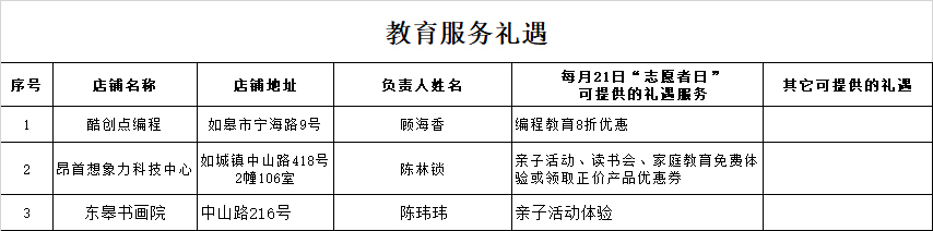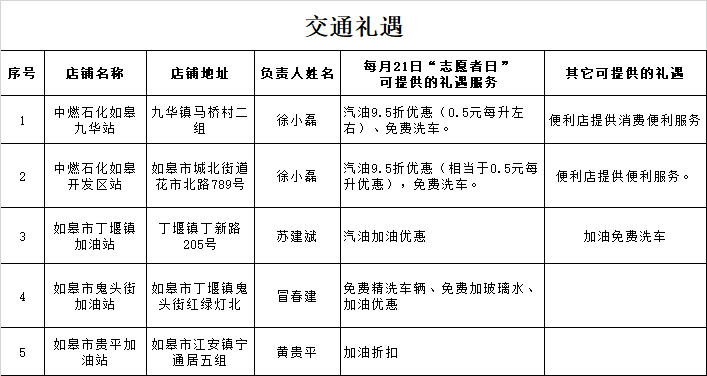 各位志愿者,您只需出示“江海志愿”志愿者注册信息页面,且当月有服务时长(我的礼遇券查看),即可在每月21日享受以下礼遇。